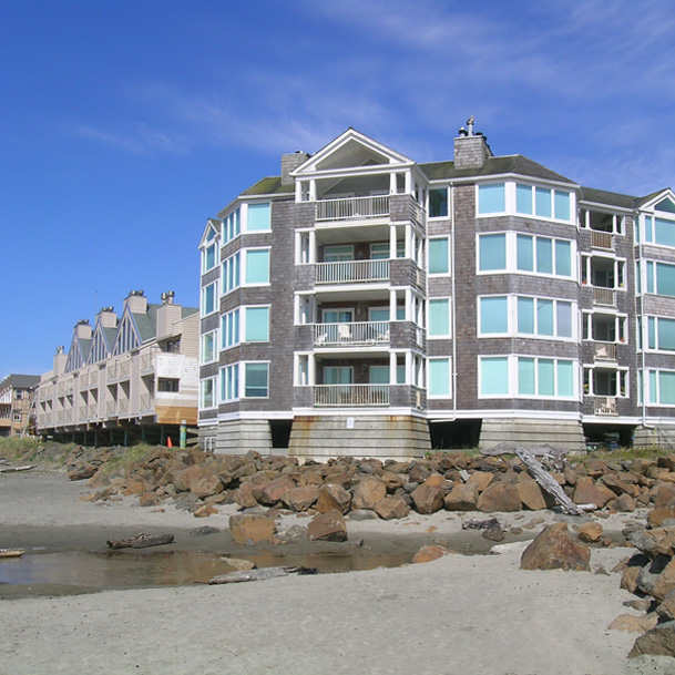 Located on an oceanfront site in the heart of the Rockaway Beach Commercial District, this 28-unit condominium project is designed with four levels of units over a one-level concrete parking structure. The project features traditional coastal architectural themes with weathered shingles and white trim. The 1,400-s.f., two-bedroom/two-bath units are designed for the second home and retirement market.